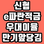 신협 e파란적금 S뱅킹가입 금리 우대이율 가입대상 만기앞당김 비과세종합저축 세율 정리 신협 e파란적금은 신협 S뱅킹을 이용해서 가입이 가능한데 우대조건 충족시 상품만기때 우대이율을 적용받는 적금상품이라고 할수 있습니다. 이 상품의 금리나 우대이율 계약기간 등에 대한 정보를 알아보겠습니다 1. 상품개요 및 특징 - 상품명 : e-파란적금 - 상품특징 : 신협 S뱅킹을 이용하여 가입할 수 있는 적금으로 우대조건 항목 충족시 만기에 우대이율을 적용받는 적금 2. 거래조건 ☞ 아래의 내용은 고객의 이해를 돕기 위하여 약정 전에 제공되는 자료로 실제 계약내용은 수령하시는 통장 또는 증서에 따릅니다. 3. 유의사항 - 상기 이율은 조합별로 상이합니다. - 만기전 해지할 경우 약정한 이율보다 낮은 중도해지이율이 적용..